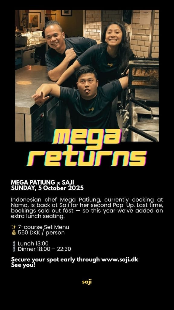 Indonesian chef Mega Patiung, currently cooking at Noma, is back at Saji for her second Pop- Up. Last time, bookings sold out fast – so this year we’ve added an extra lunch seating.